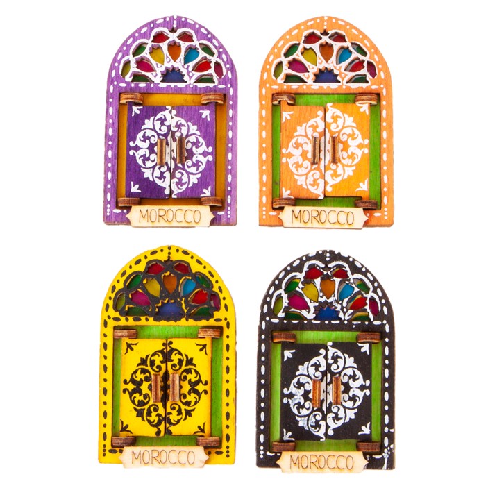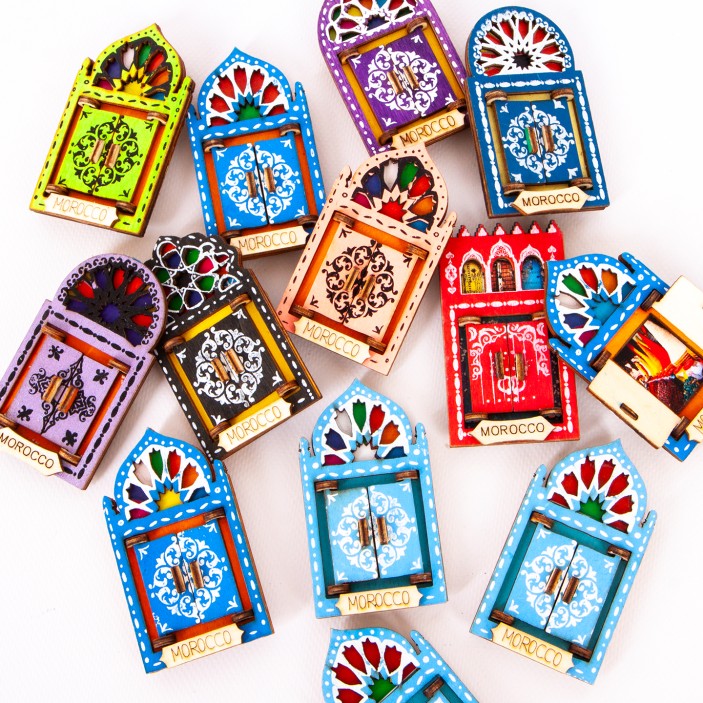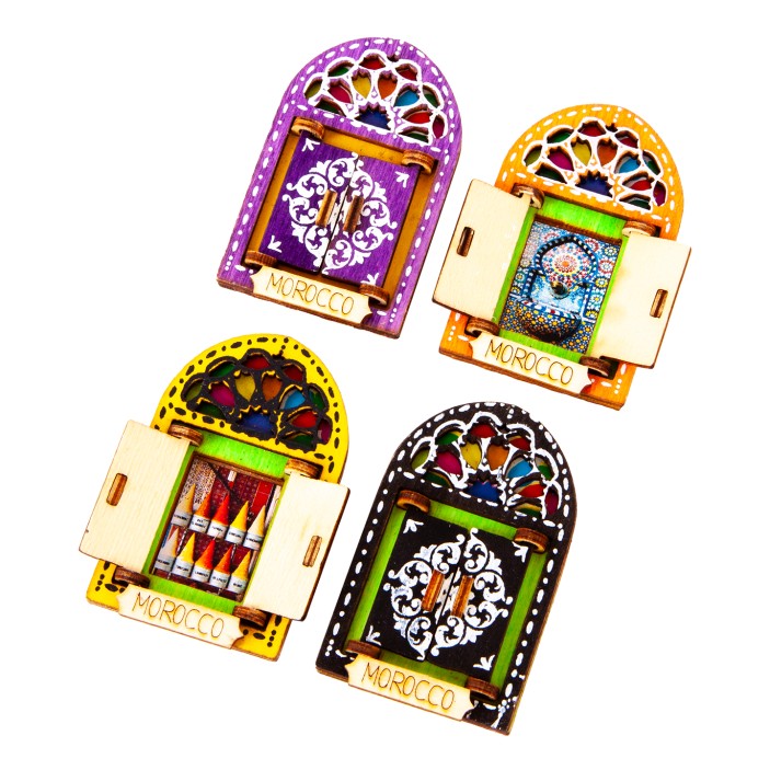 Każdy magnes posiada otwierane, drewniane drzwiczki, za którymi kryje się unikalne zdjęcie, przedstawiające kulturę, tradycję lub Marokański zabytek.