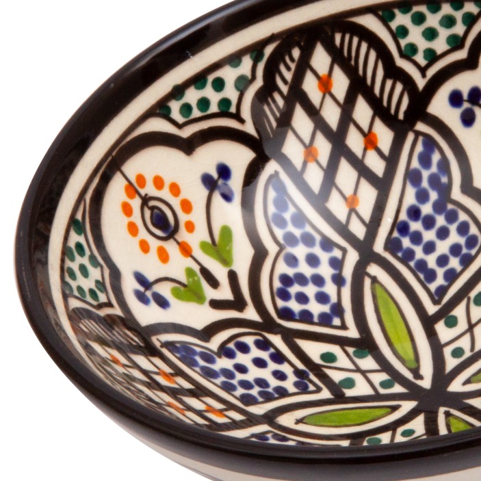 Marokańska miseczka pomalowana w fantazyjne, kolorowe wzory. Doskonale spisze się jako naczynie kuchenne do przygotowywania sosów i dipów, podawania zup lub kremów czy przekąsek. Marokańskie, geometryczne wzory wpasują się do każdej zastawy, wnosząc w codzienność orient i niepowtarzalny klimat.