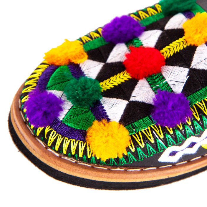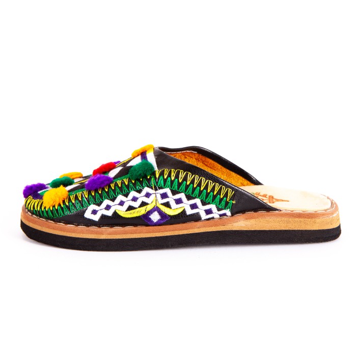 Wykonane z naturalnej, miękkiej skóry zabarwionej na czarny kolor. Przyozdobione unikatowym, kolorowym haftem, który dodaje egzotyki i wdzięku każdej parze obuwia.
